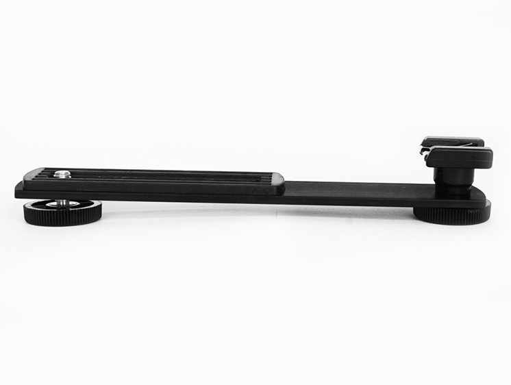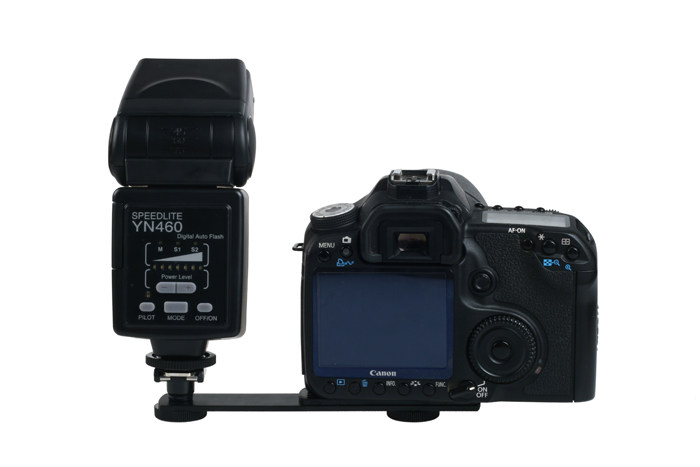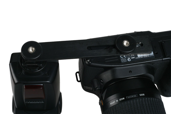 The external flash holder secures both the camera and the flash lever at the same time