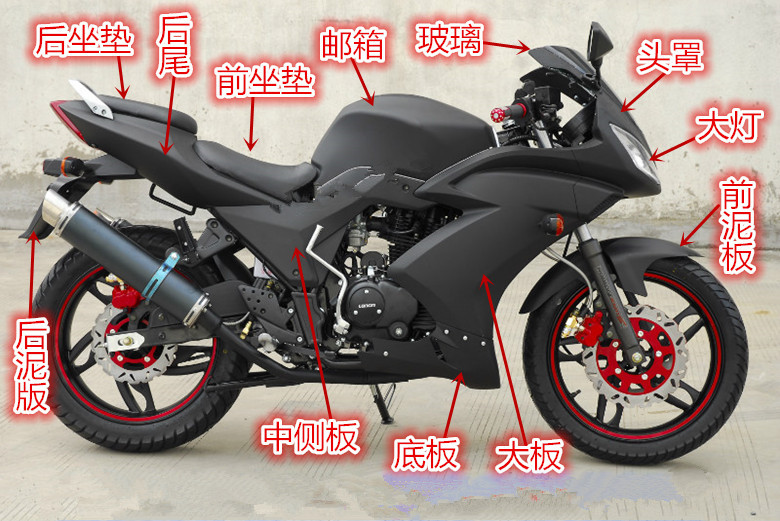 Glass hood, front clay plate, large plate, rear wall, instrument cover, fuel tank guard, living room light, brake assembly, turn light, tail light, ventilation grid, middle side plate, rear clay plate, rear inner clay plate, rear inner clay plate, chain cover, reflection