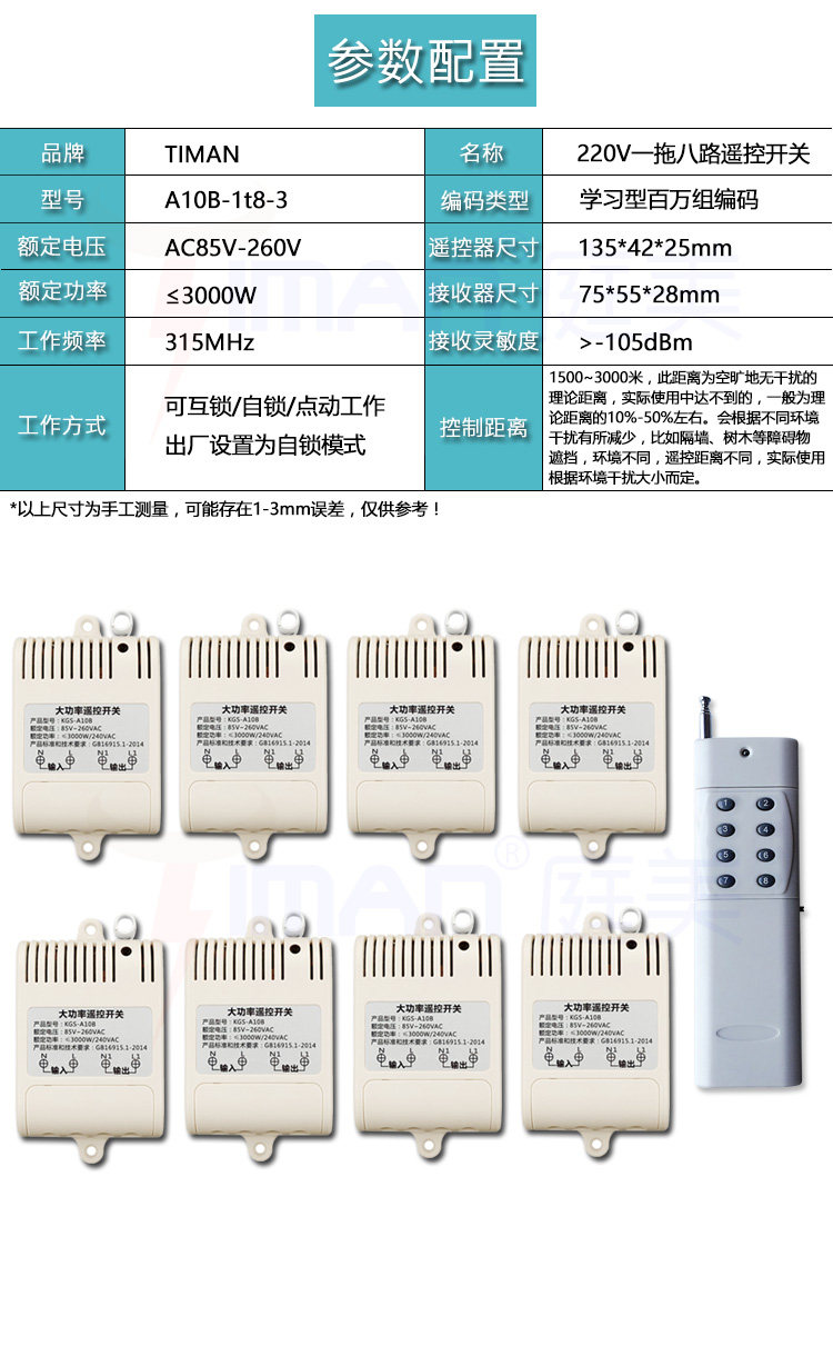 Remote control high-power industrial electrical motor wireless remote control switch 220V-one tug 8-way learning type
