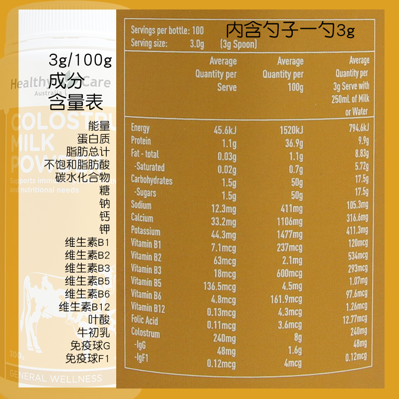 Healthy Care Bovine Colostrum Powder 300g Australian HC Imported Children and Elderly Adult Milk Powder Improves Immunity