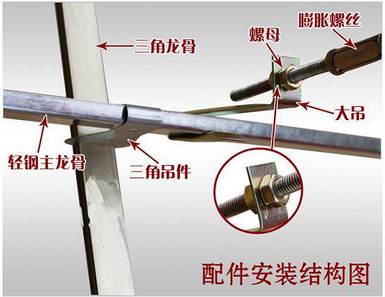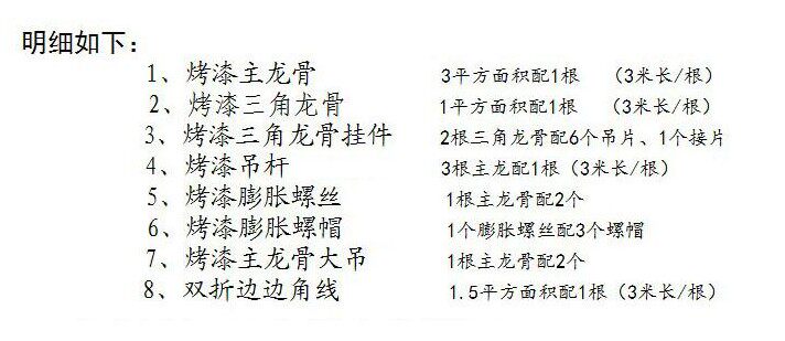 Full set of accessories main keel 1 root 3 m triangular keel 1 root 3 m wire rod 1 root 3 m corners wire silver and white 1 root 3 m large hanging 1 only puffy tube 1 and screw cap 3 triangular keel hanging pieces 3 and