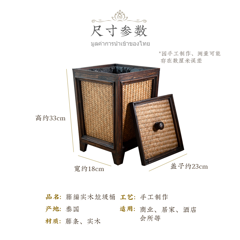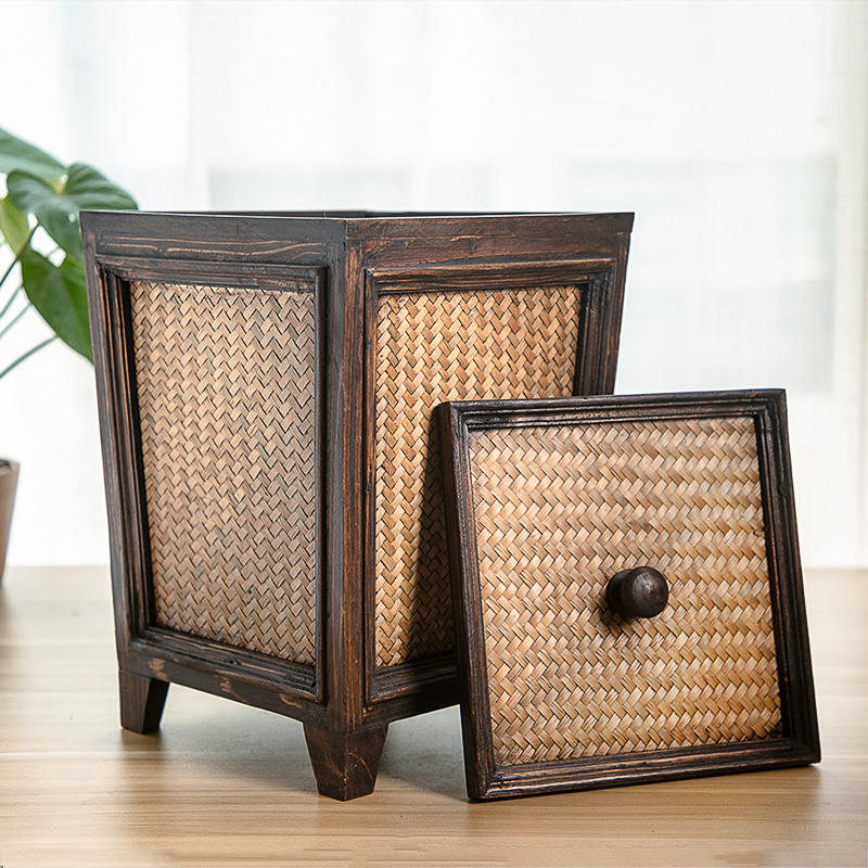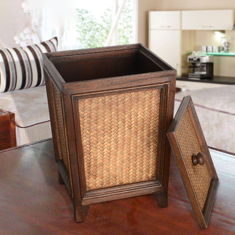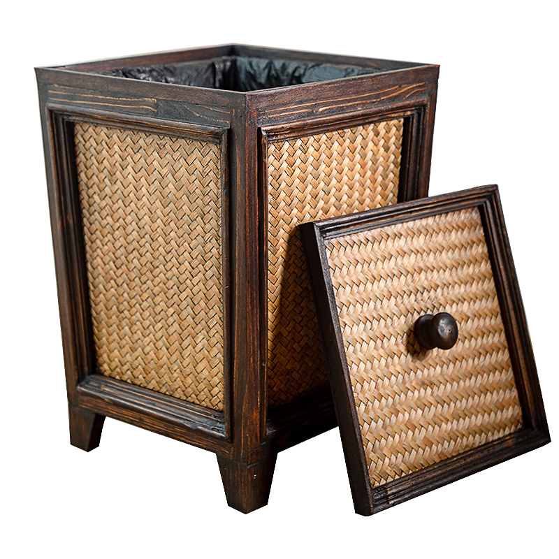 Vintage rattan woven wooden powder room paper basket with lid Living room tea room household creative personality Chinese solid wood trash can