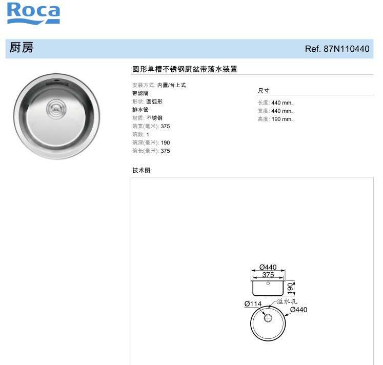 Roca Le family sink kitchen round stainless steel with water kitchen basin 87N110440 440MM
