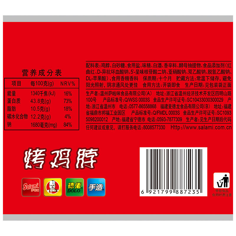 Salamy Broiler Roast Chicken Neck Meat Warm State Specialty Snack Snack Casual Snack Food 6 Packs 180g Ready-to-eat Foods