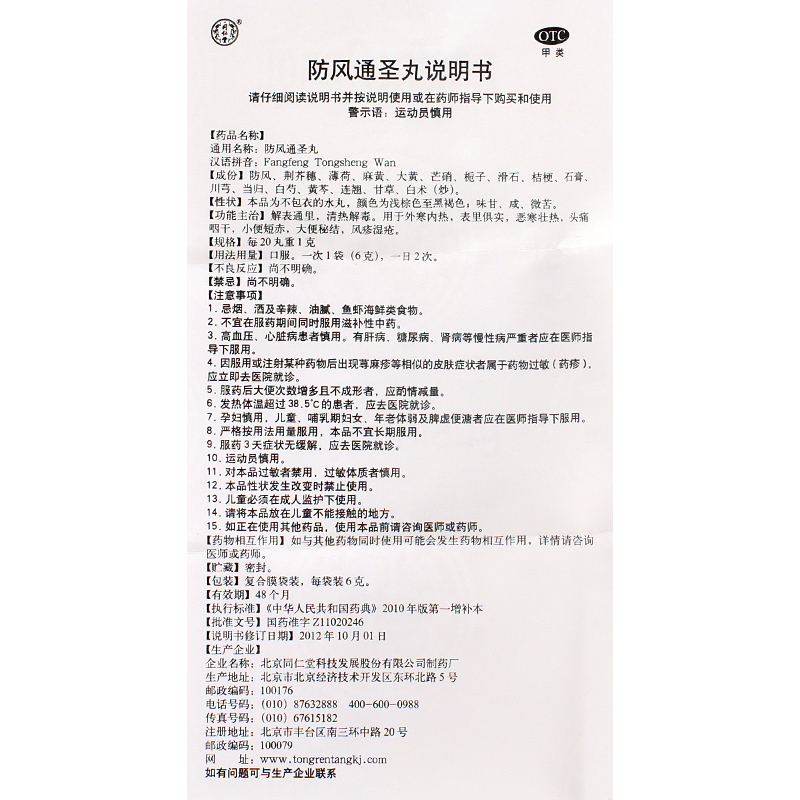 Beijing Tongrentang Windproof Through Holy Pill with Fever And Detoxifying Headache Pharyngeal Dry Large Constipation Knot 6g * 10 Bag Box