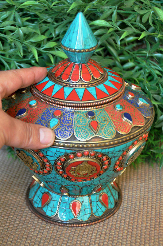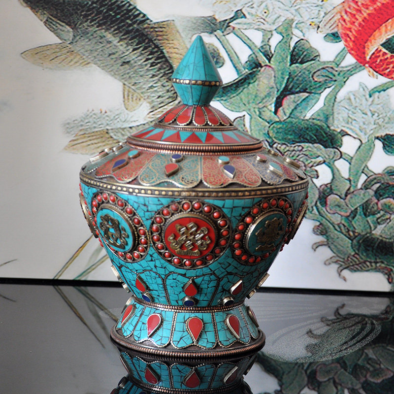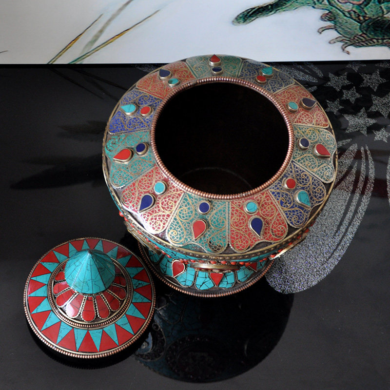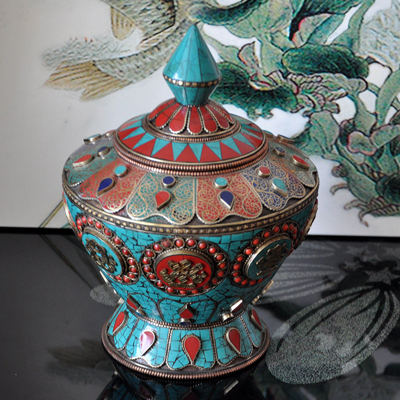 Nepal red copper green pine stone treasure bottle pure copper rice box Nepal 8 auspicious red copper bottle high 23 cm