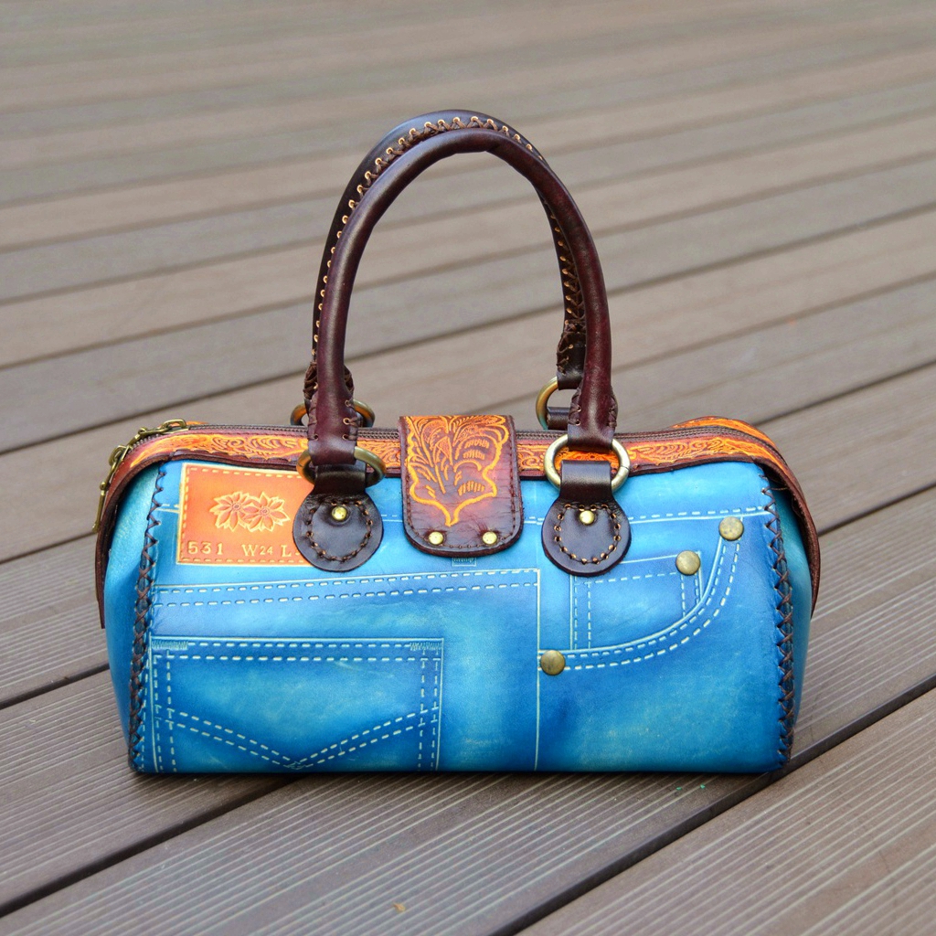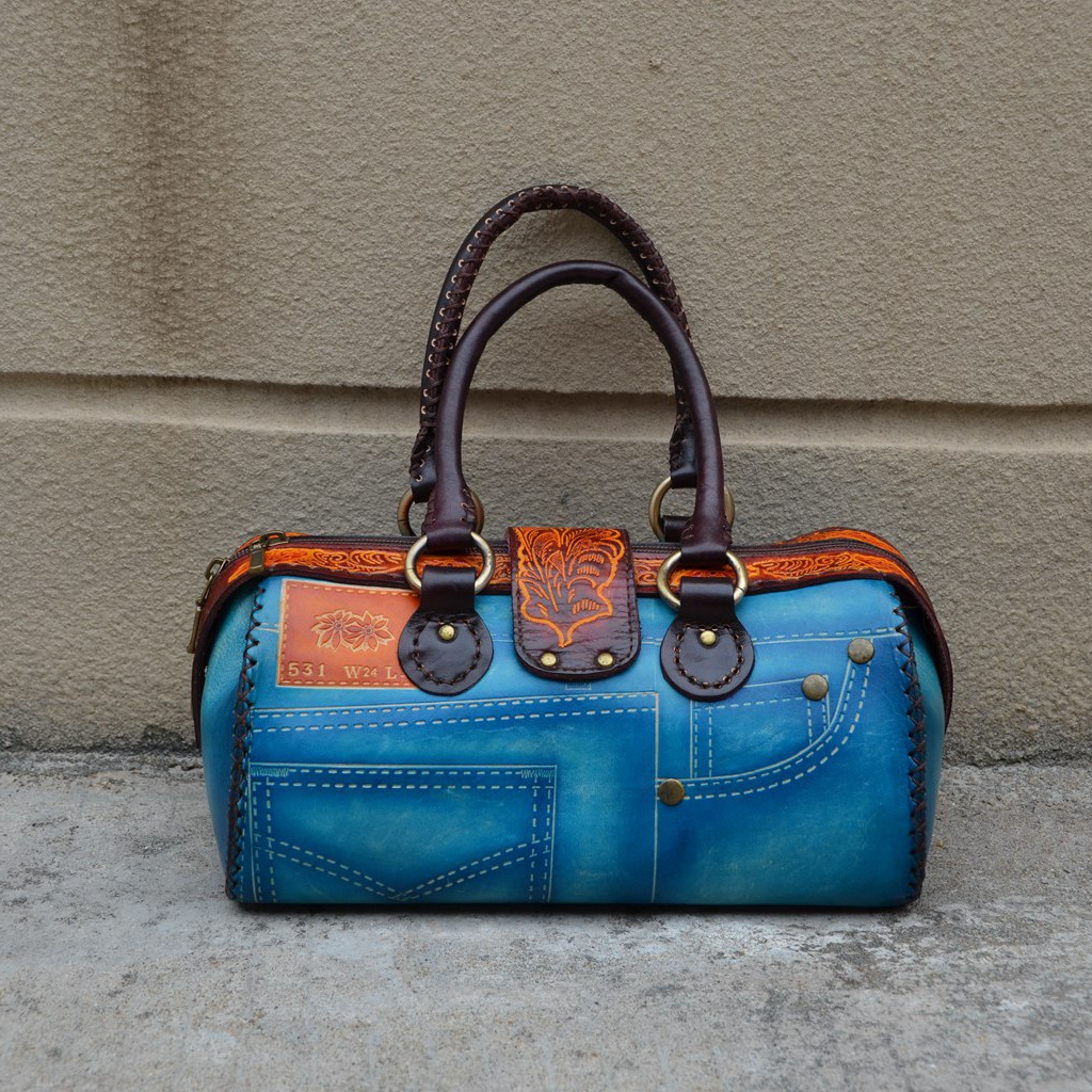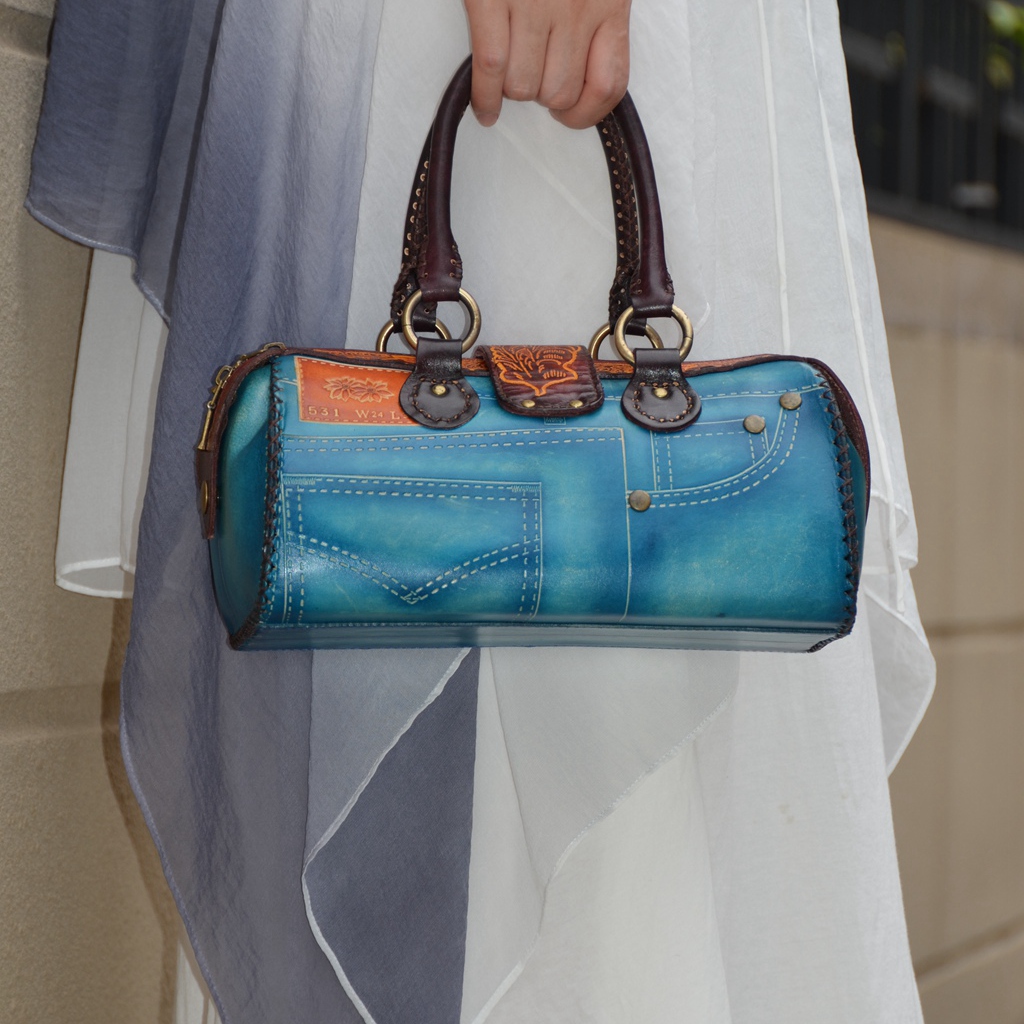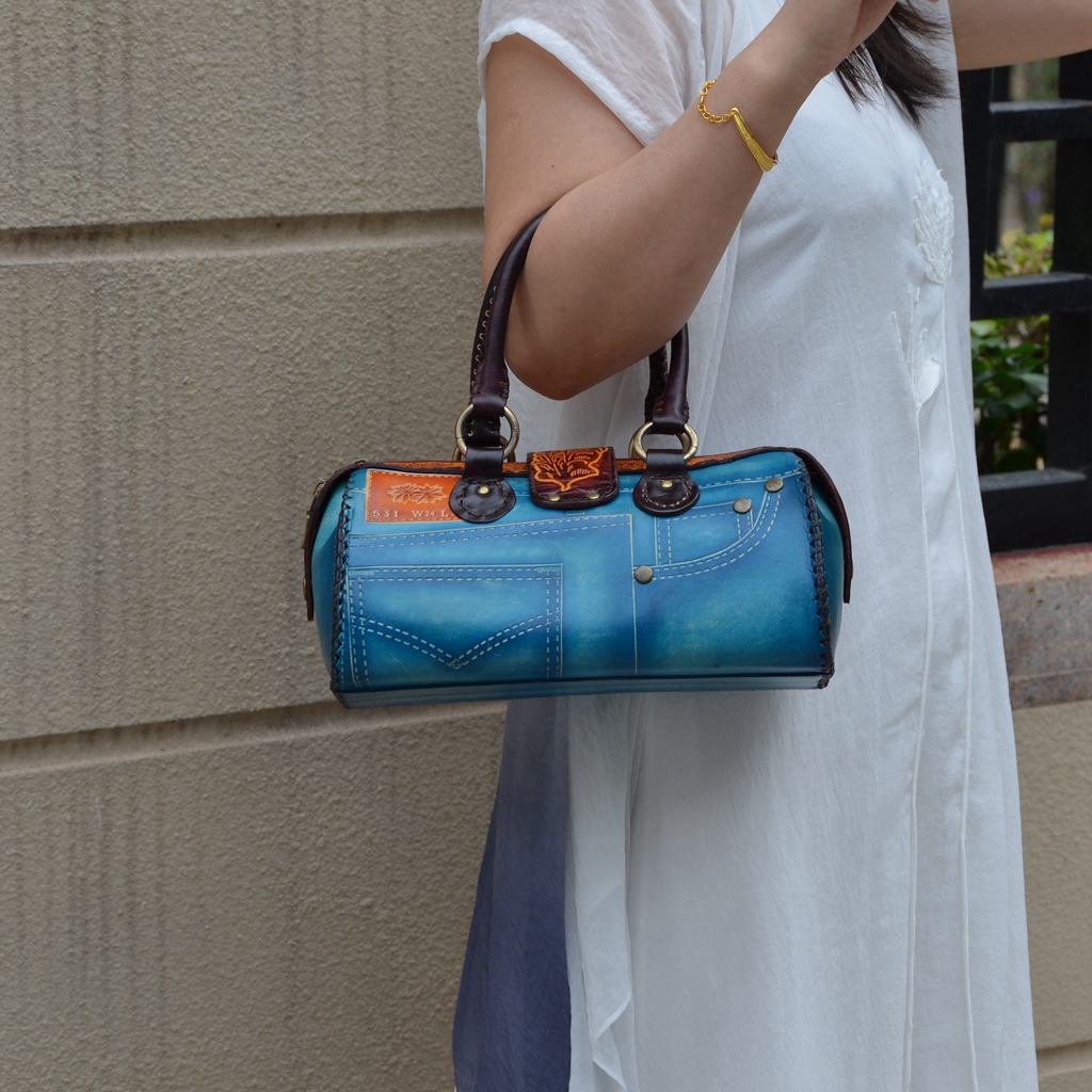 New Handmade Ladies Bag Retro National Wind Handbag Leather Sculpture Casual Twill Bag Denim Bag Genuine Leather Handbag Leather Handbag