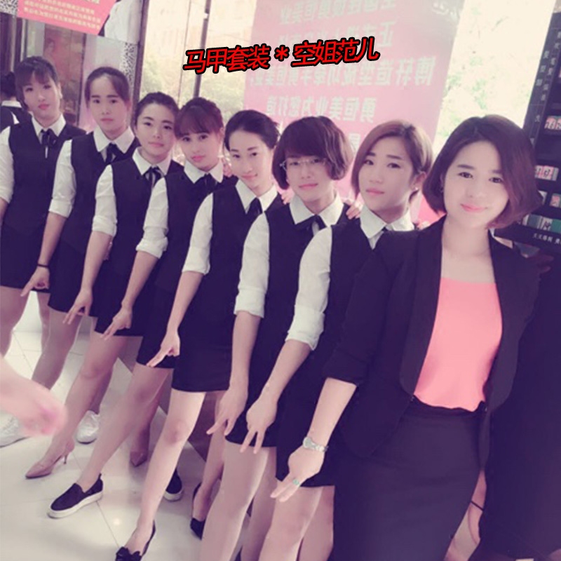 Dark blue vest skirt Long sleeve shirt Red collar tie Sky blue vest skirt Long sleeve shirt Color scarf Black vest skirt Long sleeve shirt Blue collar knot Wine red vest skirt Long sleeve shirt