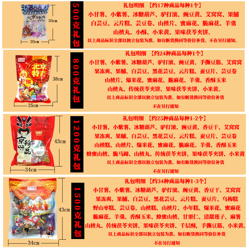 Comprehensive gift package 500 gr (17 types of snacks not delivered with handbag) Comprehensive gift package 800 gr (24 types of snacks not delivered with handbag) Comprehensive gift package 1200 grams (32 types of snack hand