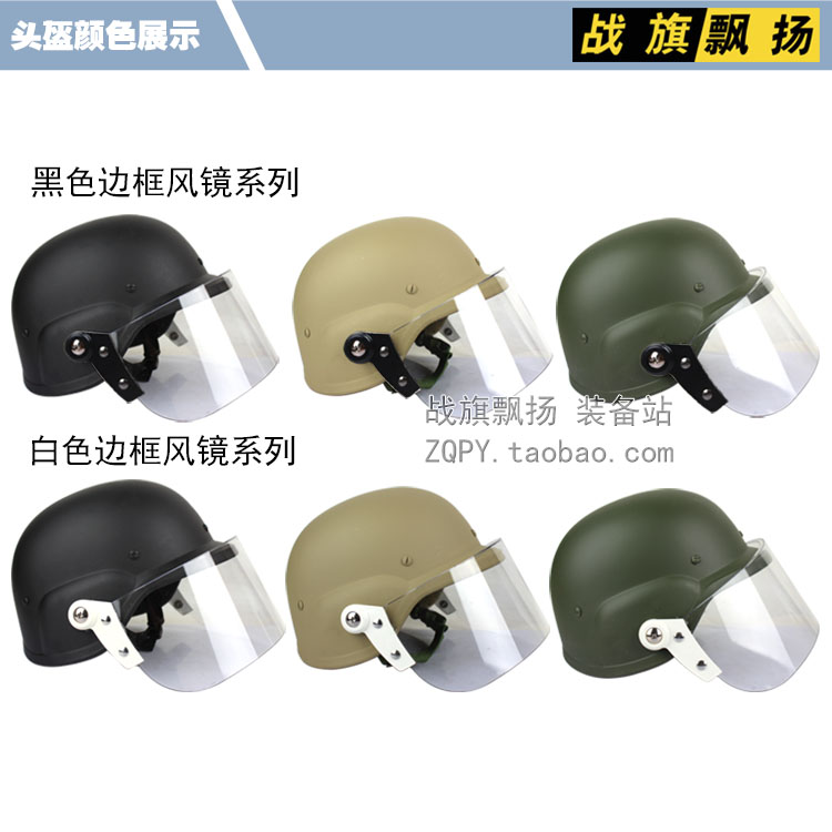 Black helmet, black frame lens, black helmet, white frame lens, green helmet, black frame lens, green helmet, white frame lens, sand color helmet, black frame lens, sand color helmet, white frame lens