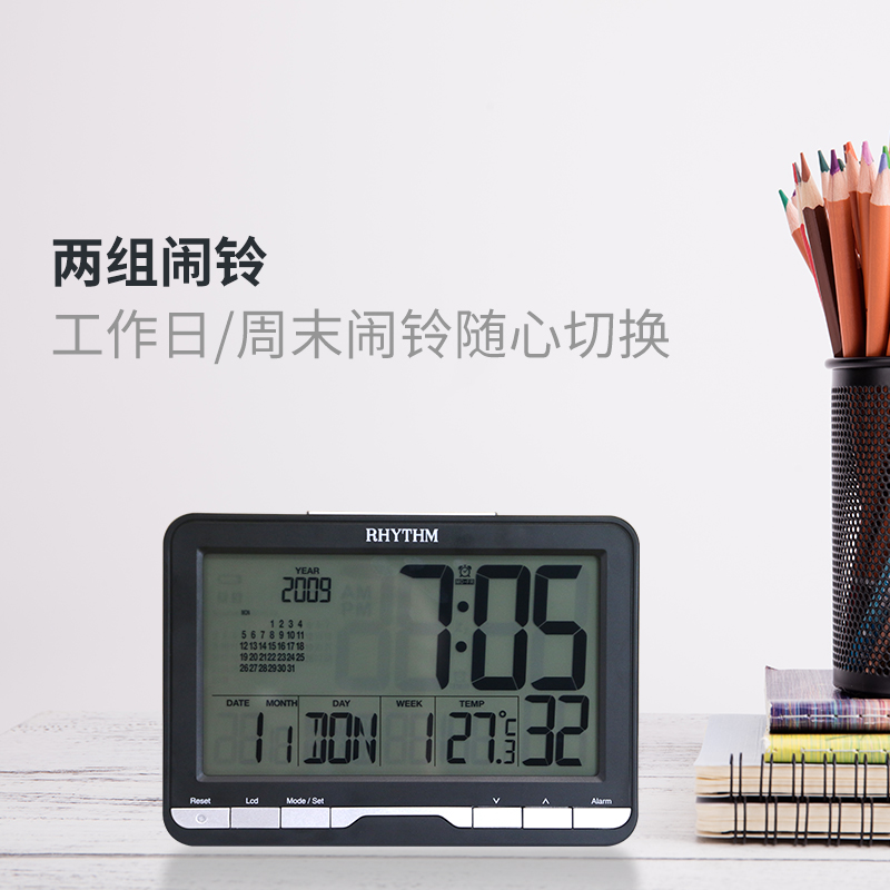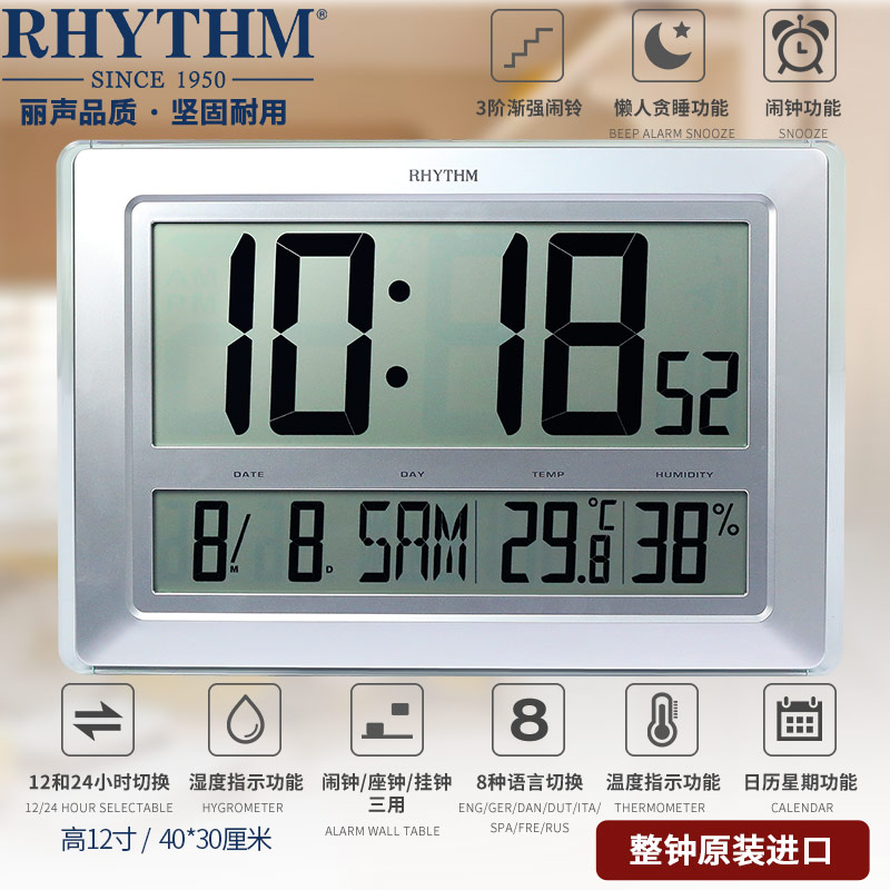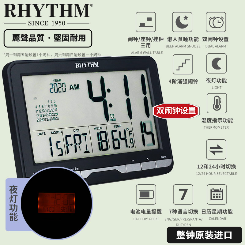RHYTHM Lisheng LCD Clock Electronic Alarm Clock Alarm Snooze Night Light Calendar Week Temperature and Humidity Seat Hanging Watch Home