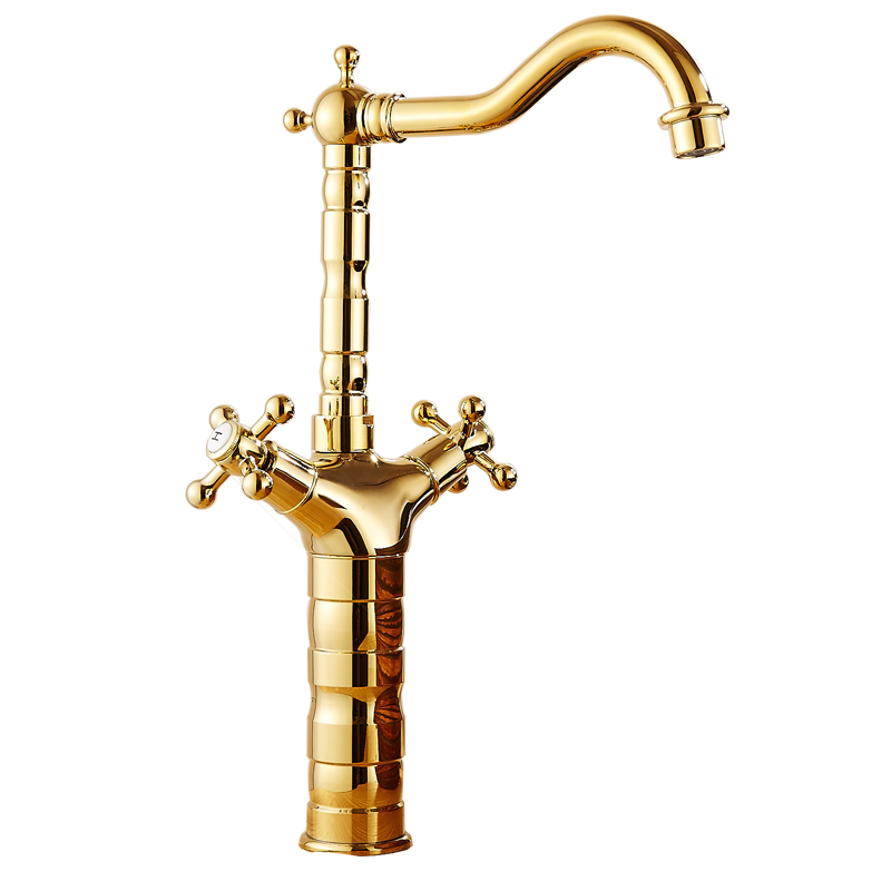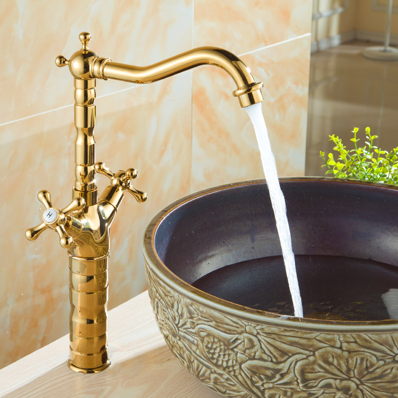 Golden tap hot and cold European style tap full copper bathroom plus high green flower porcelain table surface basin gilded antique tap