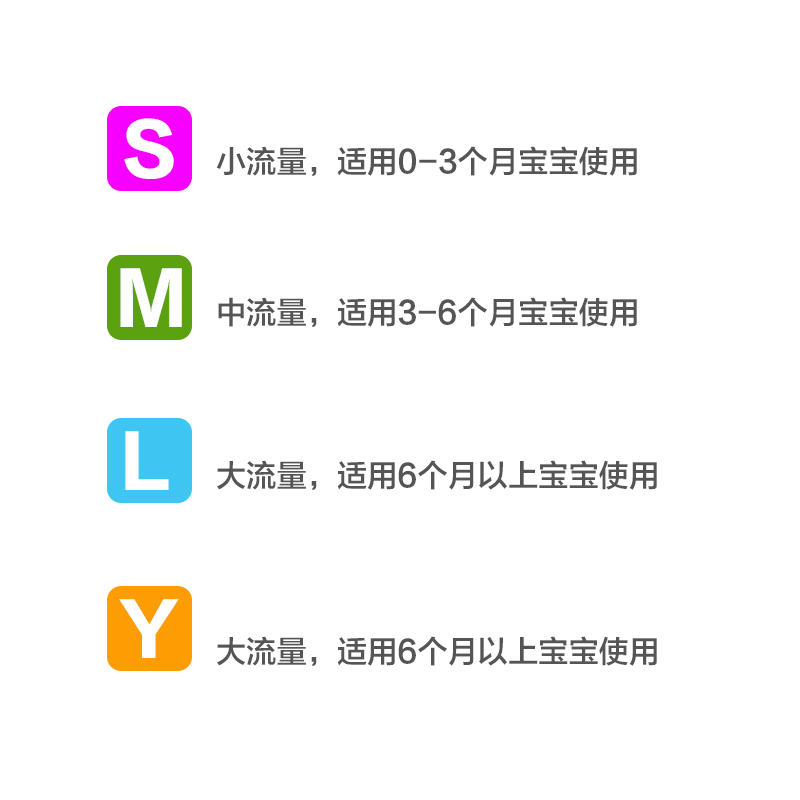 (S) round hole small flow rate (applicable 0-3 months) (M) flow rate in round holes (applicable 3-6 months) (L) round hole large flow rate (applicable for more than 6 months) (Y) Y holes