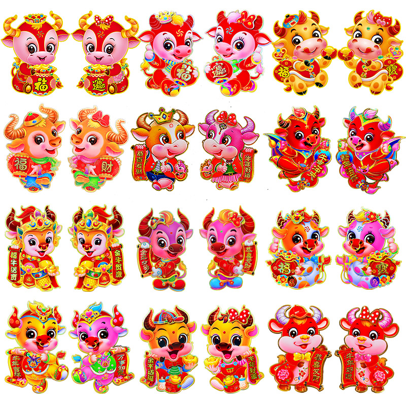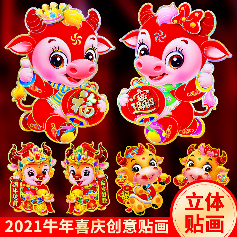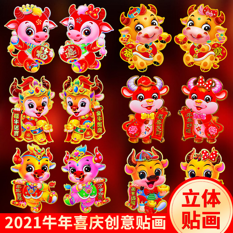 2021 Year of the ox Spring Festival blessing door stickers New Year decoration New Year decoration cartoon three-dimensional Zodiac glass window stickers
