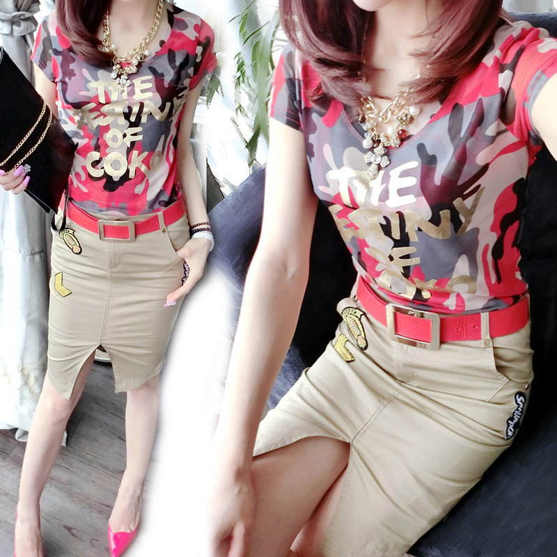 Summer new anchorwoman camouflavored T-shirt female short sleeve blouses Korean version printed with slim and compassionate half-sleeve mesh yarn kshirt-Taobao