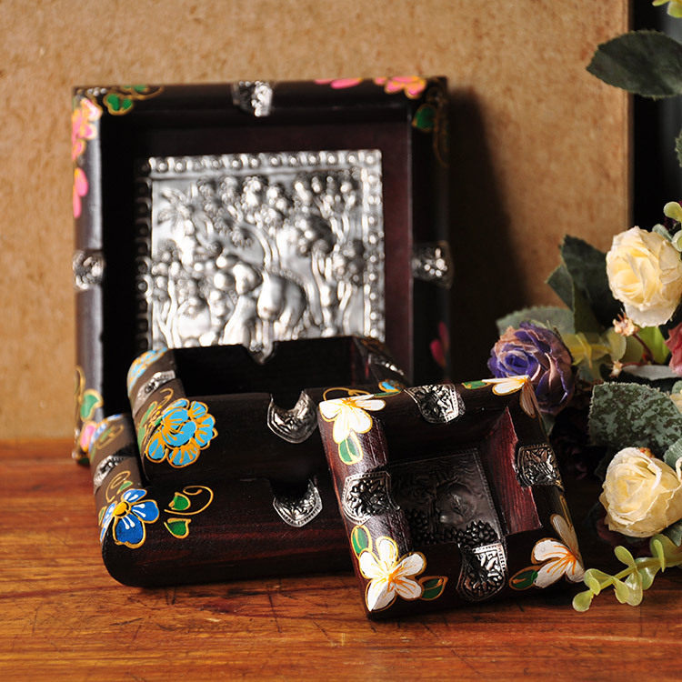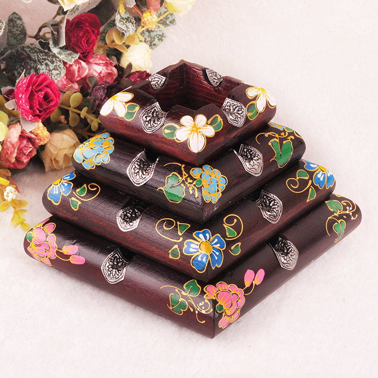Thai crafts retro ashtray personalized men's gift gift solid wood painted flower creative fashion decoration ashtray