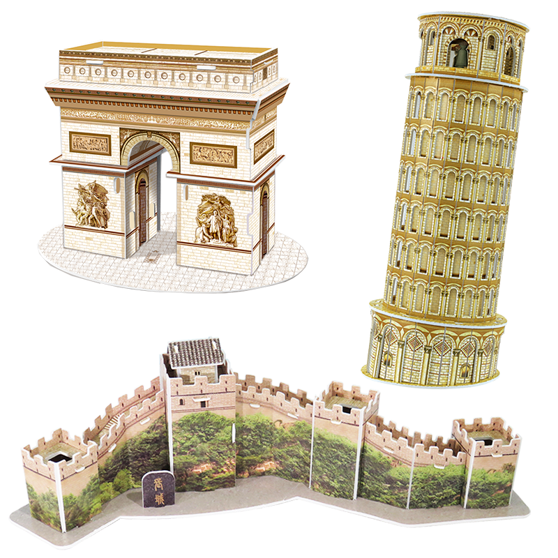 Arc de Triomphe, France, Eiffel Tower, Notre Dame de Paris, Sydney Opera House, Leaning Tower of Pisa, Sydney Bridge, Dubai Burj Al Arab, Dubai Burj Khalifa, Statue of Liberty, Empire State Building, Twin Bridges, Great Wall of China, Temple of Heaven, Tiananmen Square