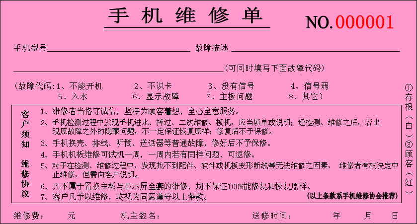 Mobile phone Shop Supplies phone repair Single mobile phone sales Private notes Two-linked notes This document receipt