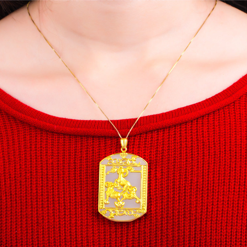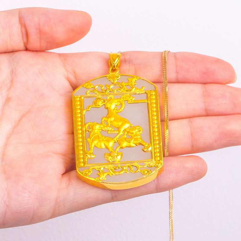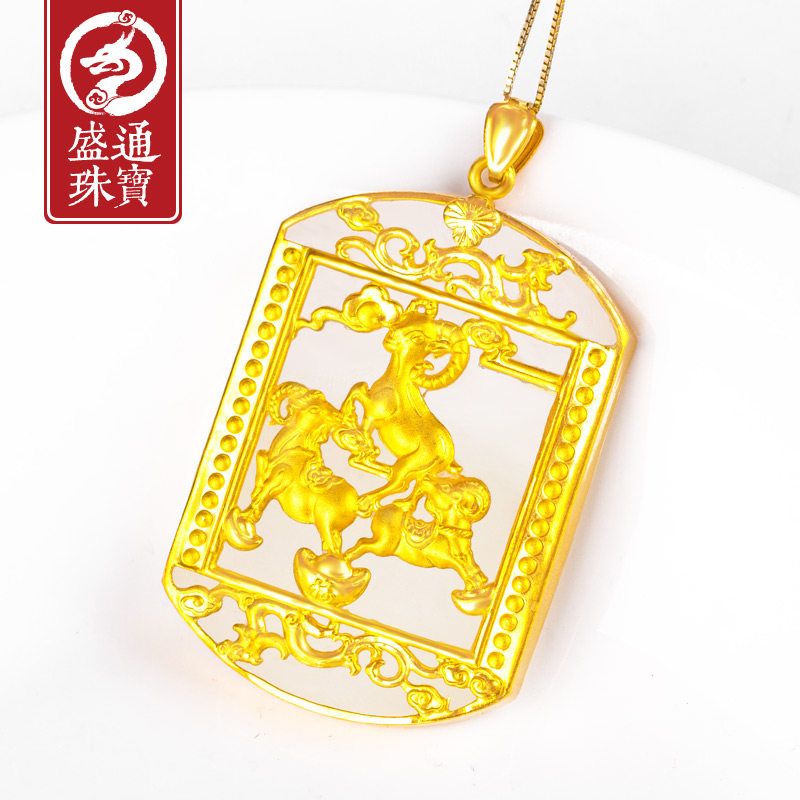 Shengtong Jewelry Gold Inlaid Jade Pendant Hetian Jade Sanyang Kaitai Jade Brand Men's Large Zodiac Sheep Jade Pendant