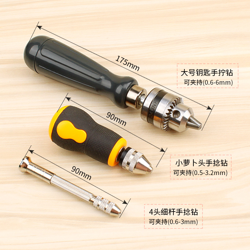 4 Head thin rod hand twist drill (excluding drill bit) 4 head thin rod hand twist drill set (including 10 drill bits) Small radish head hand twist drill (excluding drill bit) Small radish head hand twist drill set (including 10