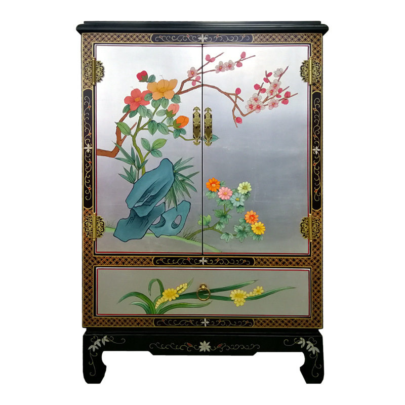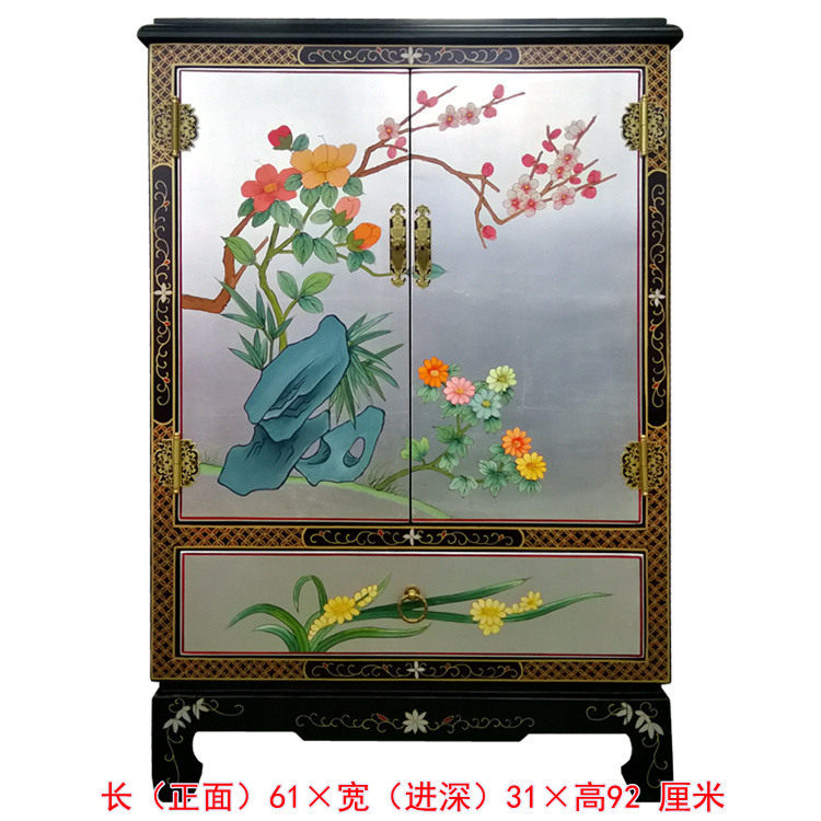 Lacquer art color painted silver land flowers and birds Double door One draw shoe cabinet Xuanguan to decorate Yangzhou lacquerware New classical furniture