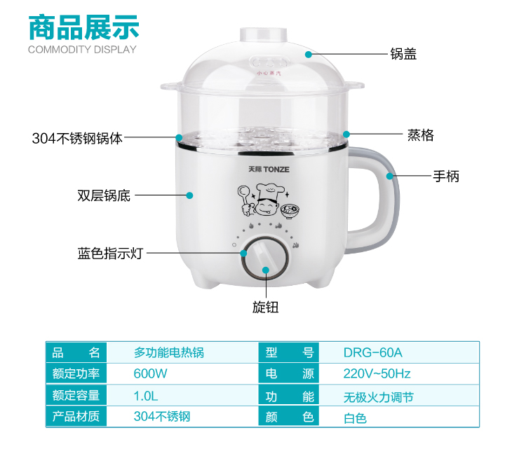 Tonze skyline DRG-60A multifunctional electric heating pot 1l boiling water electric cooking pot Porridge cooking noodle pot egg steamer