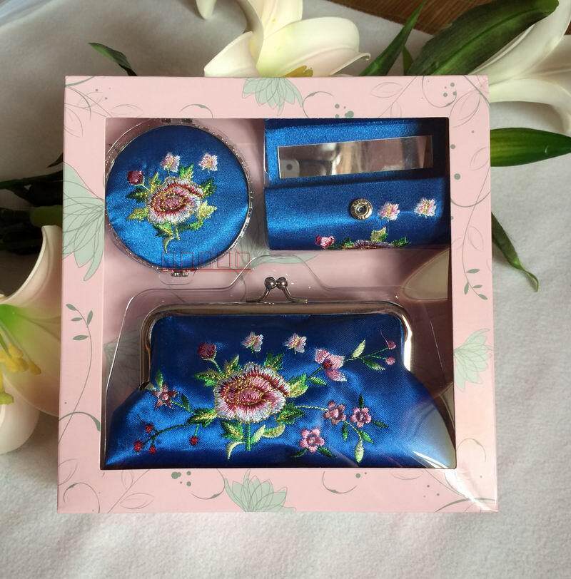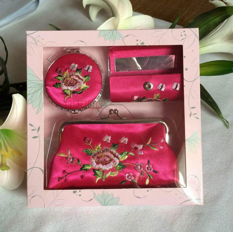 Suzhou characteristic high-end silk gift three-piece gift box exquisite embroidered mirror lipstick box coin purse set