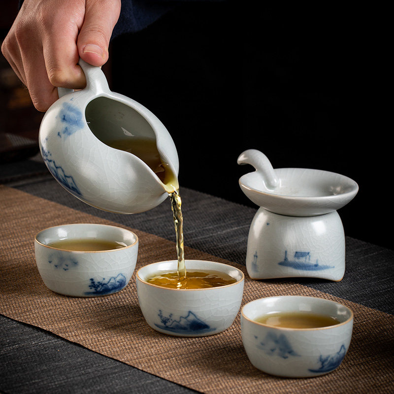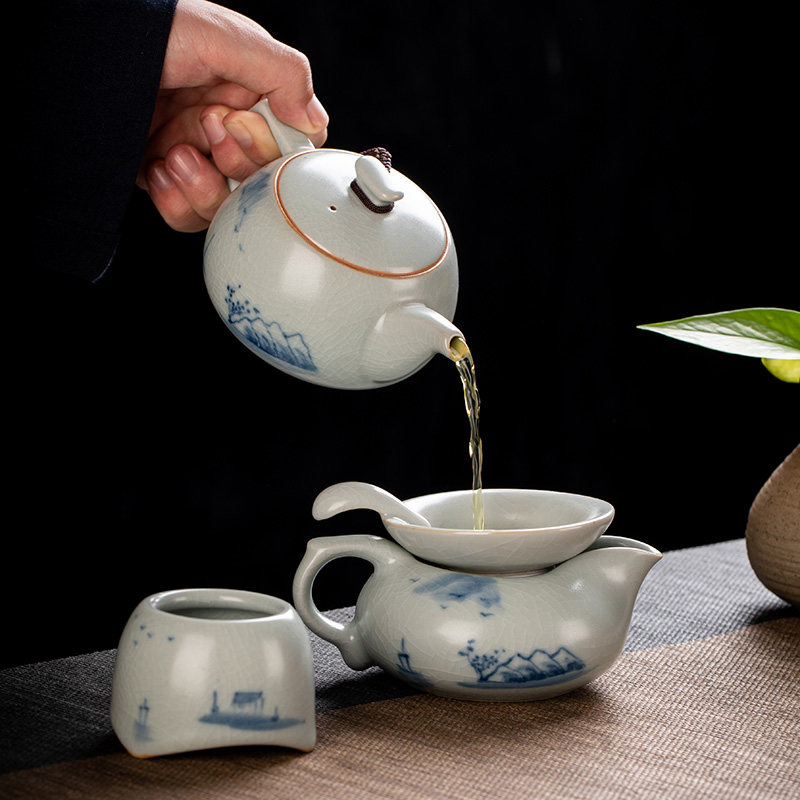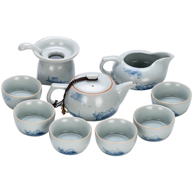 Blue and white porcelain hand-painted Ru Kiln tea set Ru Tao Ru Porcelain open piece Kung Fu tea set High-grade teacup Teapot gift box
