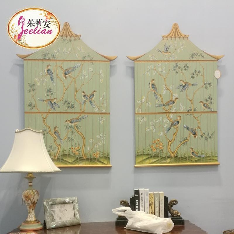 American Neoclassical bird cage hanging painting Hand-painted flowers and birds painting French green villa model room hanging painting mural pair