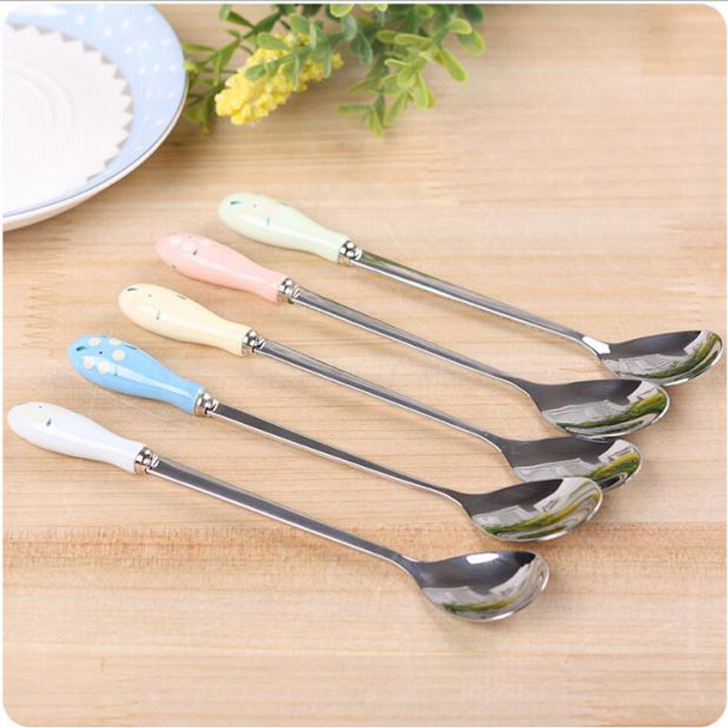 Ceramic handle stainless steel coffee short spoon zakka cartoon cute color small floral short spoon spoon stirring spoon