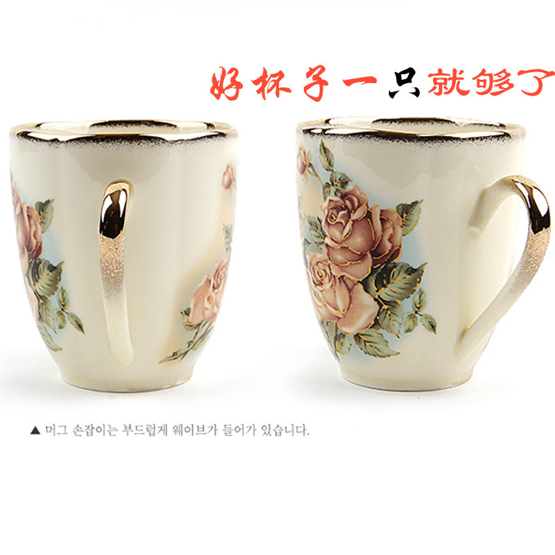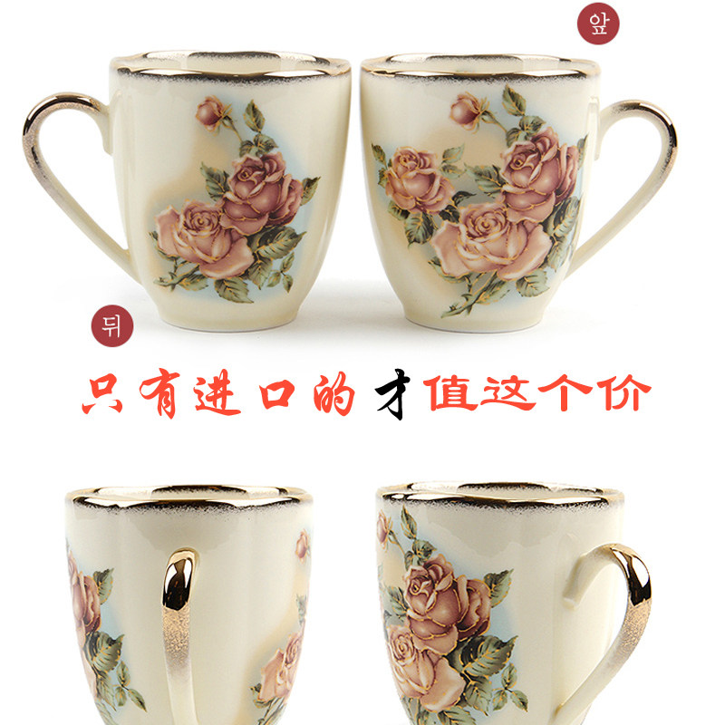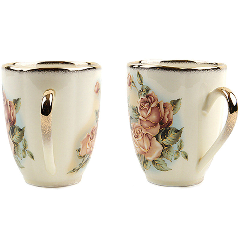 There are small cups with gold rim, one with large cups with gold rims, one with small cups with gold rims, two with gift boxes, with large cups with gold rims, two with gift boxes