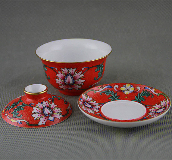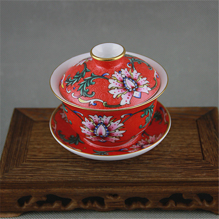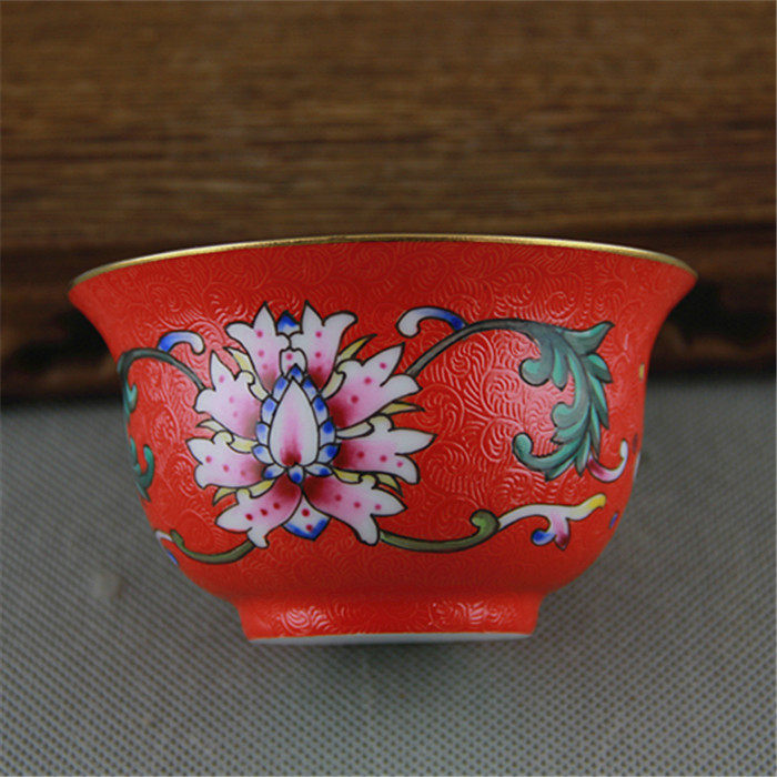 Qingganlong red grilled pastel tangled flowers Horseshoe rice cup lid bowl climbing flower kung fu teacup Boutique antique porcelain