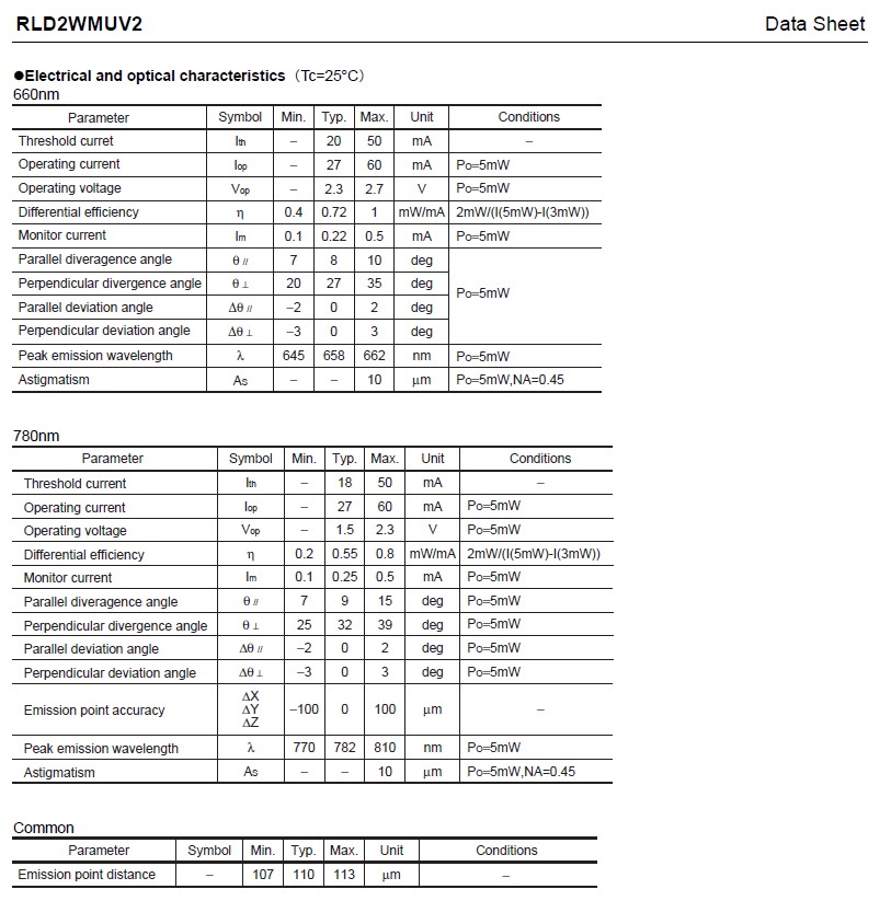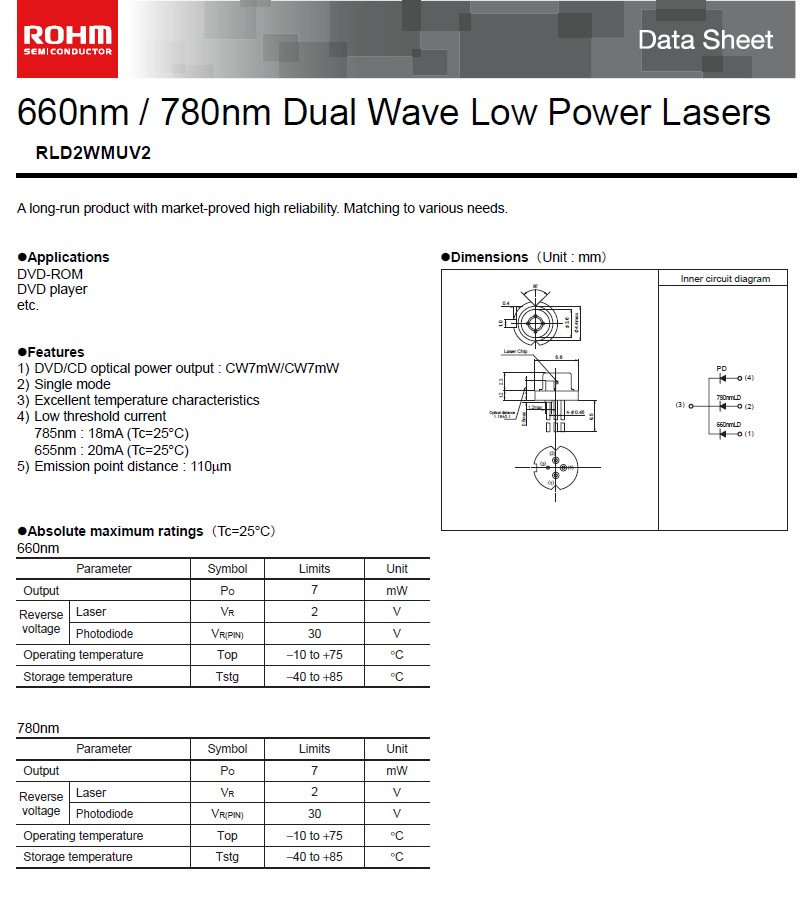 ROHM RLD2WMUV2 650nm785nm 7mw Dual Wavelength 4 Feet DVD-ROM M Station