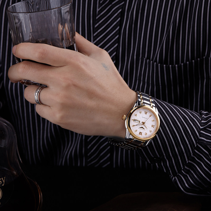 Between gold and white background Between gold and black background Stainless steel black surface Stainless steel white background Roman scale natural white face blue nail Roman scale gold and white face Roman scale gold black face Roman scale natural white face Rome