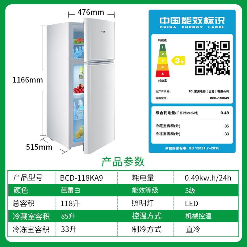 TCL118 Liter Small Fridge Meme Small Home Double Door Refrigerator Two-door Energy Saving Rental Dorm Room Duo
