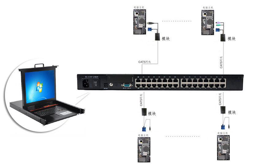 17-inch LED KVMAll8 Road CAT5 KVM switcher RJ45 Network route KVM-1708C with modules