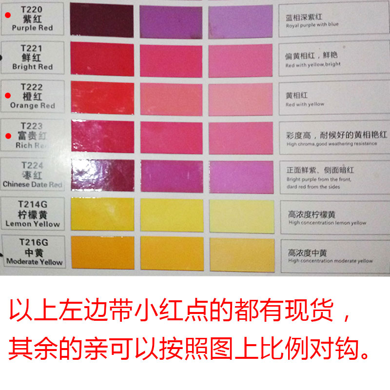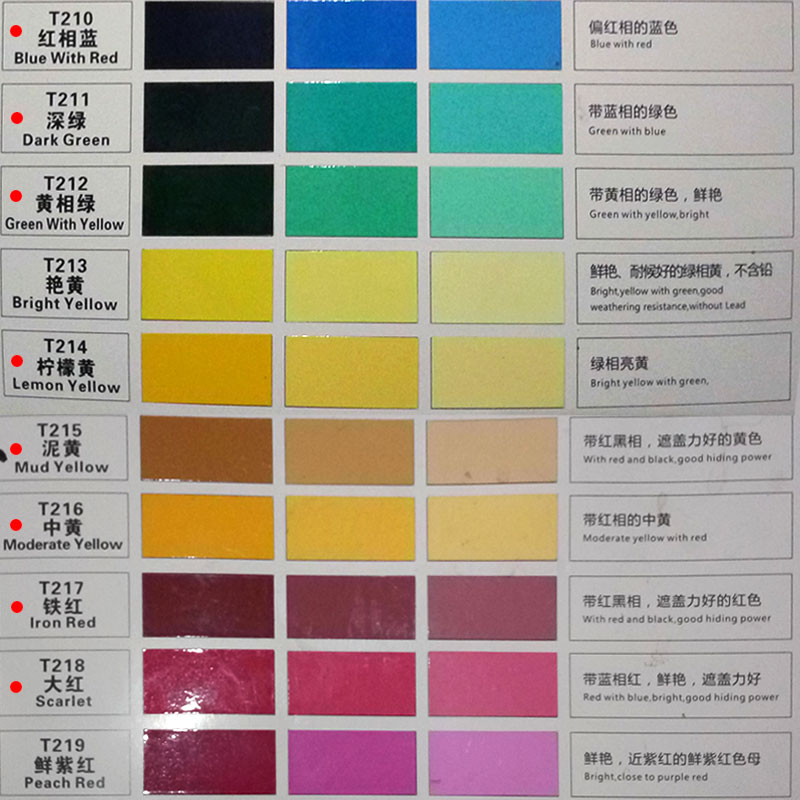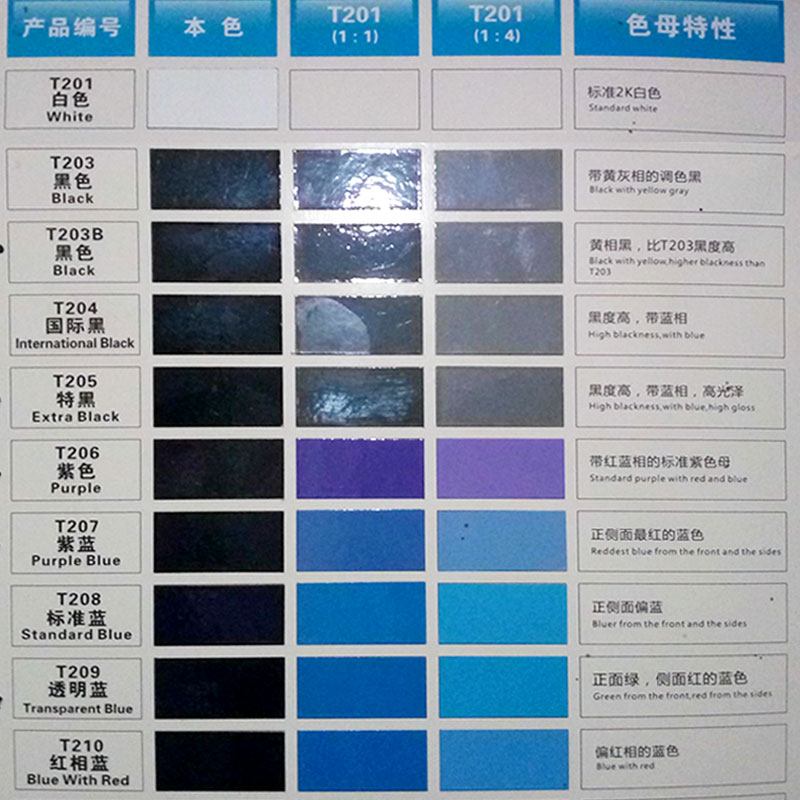 T201 pure white (1 liter) T209 bright blue T216 in yellow T207 purple blue T203 black T210 red phase blue T217 iron red T204 country