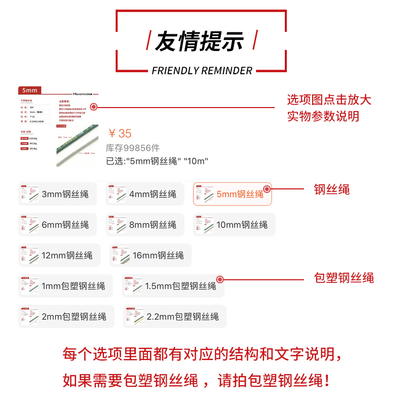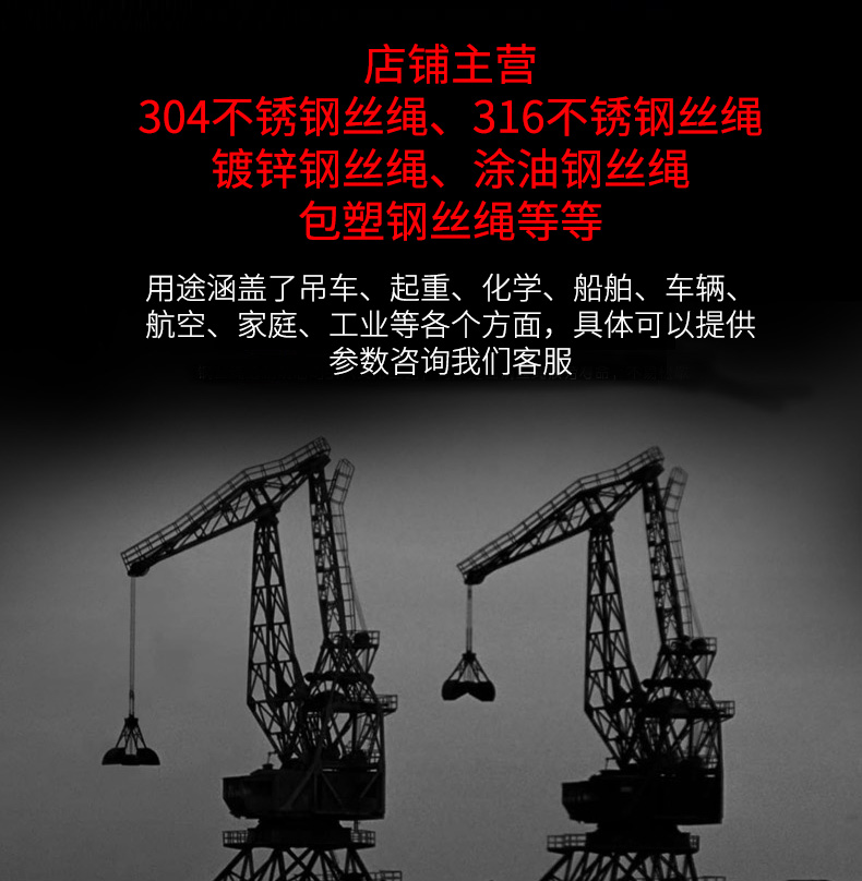 Customized 0.5mm wire rope 0.8mm steel wire rope 1mm steel wire rope 1.2mm steel wire rope 1.5mm steel wire rope 2mm steel wire rope 2.5mm steel wire rope 3mm steel wire rope 4mm steel wire rope (7*19 super soft) 5mm steel wire rope 6mm steel wire rope 8mm steel wire rope 10mm steel wire rope 12mm steel wire rope 4mm steel wire rope (7*7 partial hard) 16mm steel wire rope 1mm overmolded steel wire rope 1.5mm overmolded steel wire rope 2mm overmolded steel wire rope 3mm overmolded steel wire rope 4mm overmolded steel wire rope 5mm overmolded steel wire rope 6mm overmolded steel wire rope