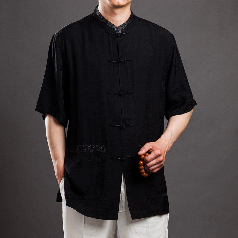 Broken code special price 8110 men's Tang suit summer suit short-sleeved top black ultra-thin fabric diamond-studded fashion men's Tang suit