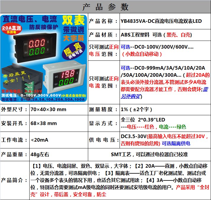 DC0-100V 300V 600V digital display voltmeter current double-meter LED DC voltage current double-display table