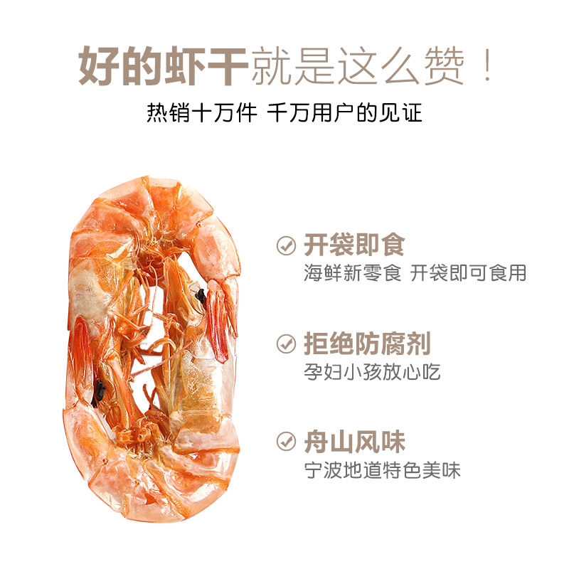 208g dried large shrimp (40-50pcs) 208g (40-50pcs) + 1 bag of crispy shrimp (8 packs independent) Medium 1 kg (about 150 pcs) Large 1 kg (about 110 pcs) King Shrimp 420g (length approx. 12 cm)