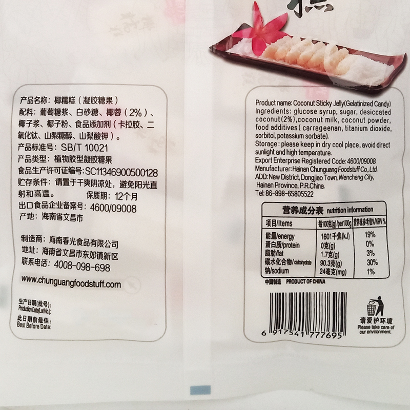 Glucose syrup white granulated sugar coconut milk coconut powder food additive (carrageenan gelatin titanium dioxide) edible flavor edible salt
