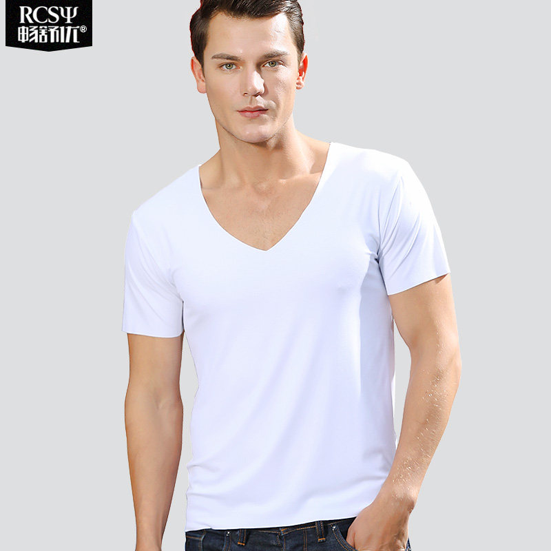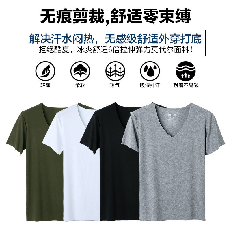 Summer thin loose and comfortable seamless modal ice silk V-neck short-sleeved men's laser cutting self-cultivation solid color bottoming