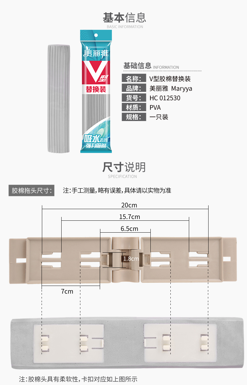 Meliya V-shaped spare parts 1 pack European-style rubber cotton floor mop replacement head sponge head folded narrow mouth mop head