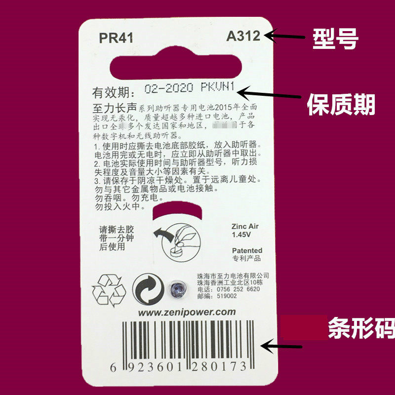 Zhili Changsheng Zenipower ear canal hearing aid battery A312 1 45v mercury-free button zinc-air battery