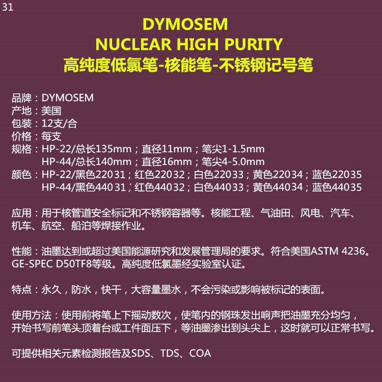 DYKEM HIGH PURITY 44 LOW CHLORINE HIGH PURITY pen Nuclear Industrial pen Stainless steel marker pen