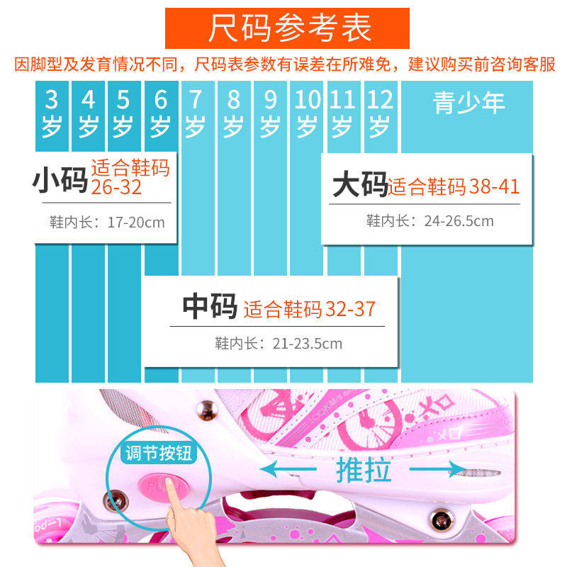 Small code S (shoe mark 31-34) recommended for 3-5 years old to 7-year-old code M (shoe mark 35-38) recommended 6-9 years old to 10 year old for big code L (shoe mark 39-42) push