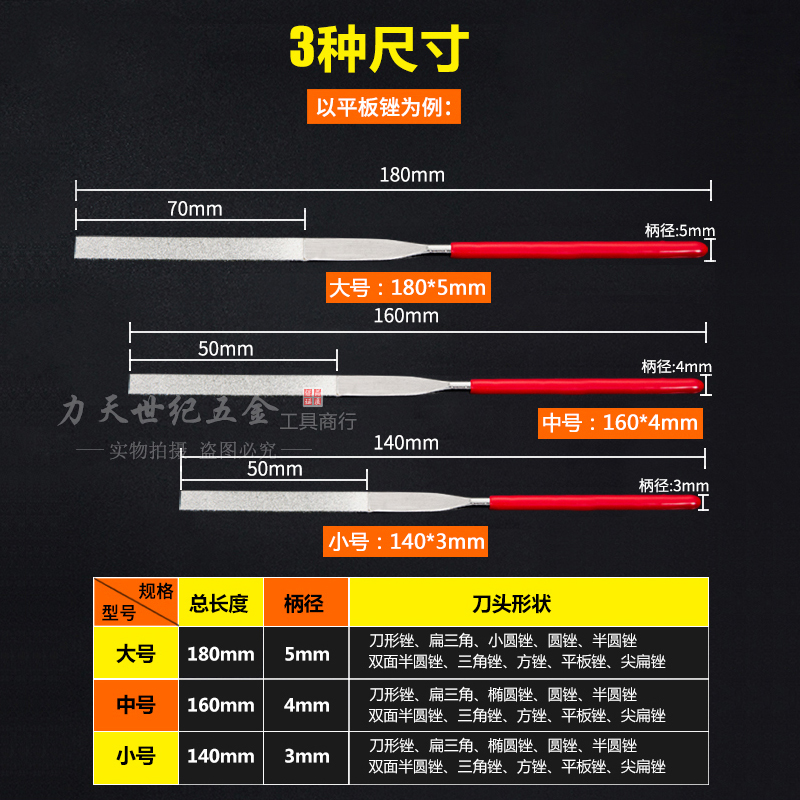 Flat file (180*5mm) 1 semicircular file (180*5mm) 1 triangular file (180*5mm) 1 square file (180*5mm) 1 small round file (