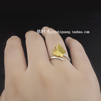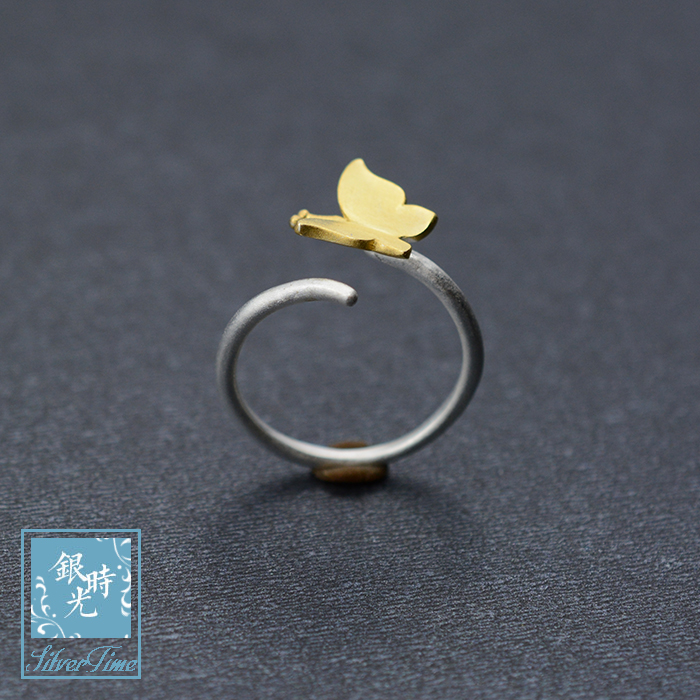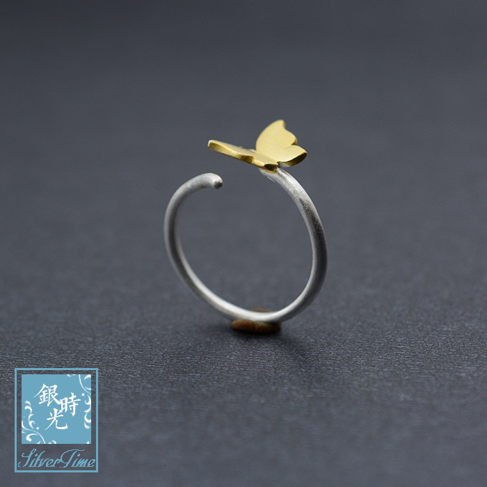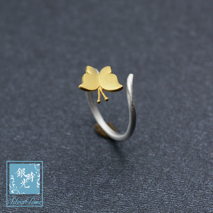 Designer Custom S925 Silver Pure Handmade Gold Plated Brushed Butterfly Ring Open Adjustable Ring Women