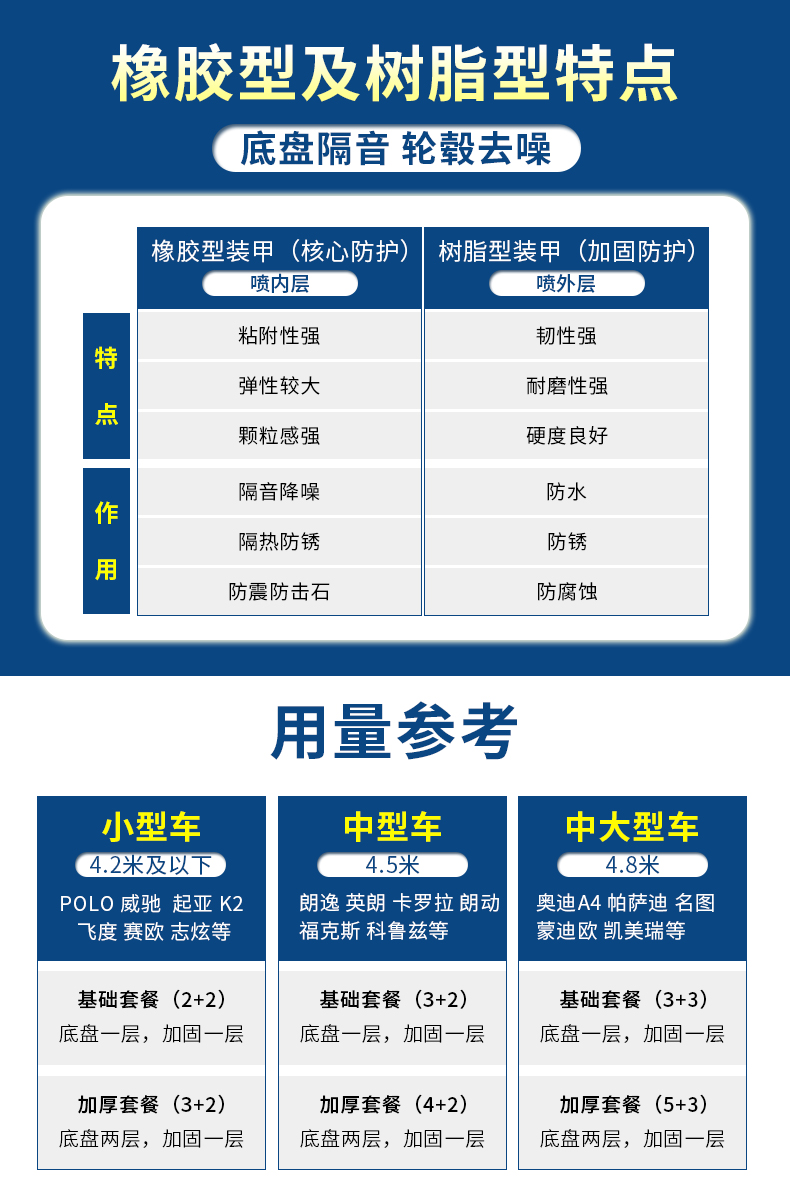 Small cars (cars under 4.2 meters) (rubber type + resin type) stronger (lifetime warranty) Medium car (4.2-4.6 meters car) (rubber type + resin type) Stronger (lifetime warranty) Medium and large cars (4.6-4.9 meters car) (rubber type + resin type) Stronger (lifetime warranty) Large cars (4.9 meters or more) (rubber type + resin type) Stronger (lifetime warranty) Small car spray (4.2 meters or less) (rubber type + resin type) Stronger (lifetime warranty) Small car spray (rubber type + resin type) Stronger (lifetime warranty)